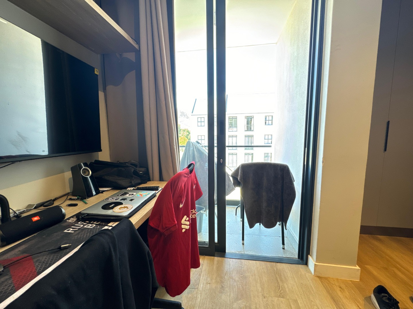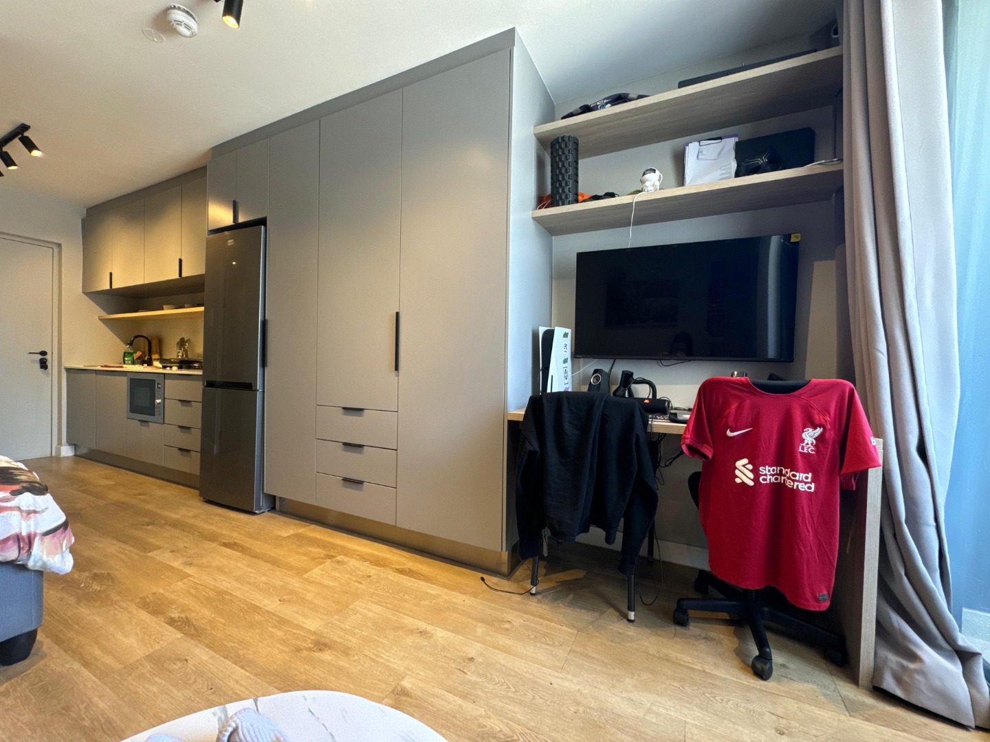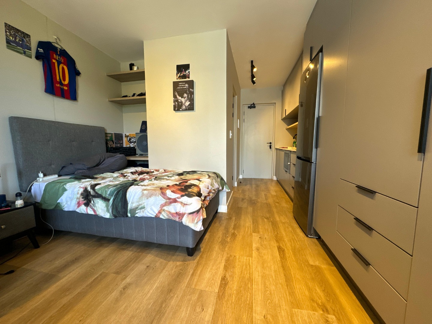 This modern, furnished studio apartment is situated within 'THE ONE' building in Dennesig, Stellenbosch. Designed for efficient living, the unit features a compact yet stylish kitchenette equipped with light grey cabinetry, white countertops, and integrated appliances including a microwave and refrigerator. The interior boasts contemporary wood-look laminate flooring and extensive built-in storage solutions, complemented by a dedicated desk area, ideal for students or professionals.