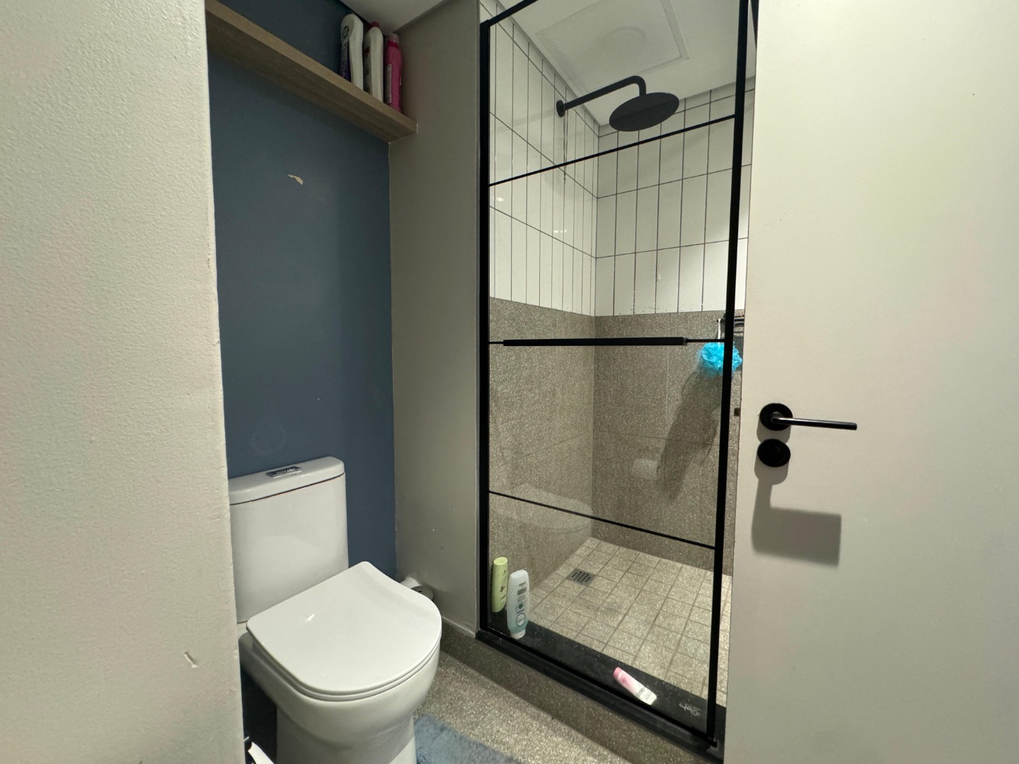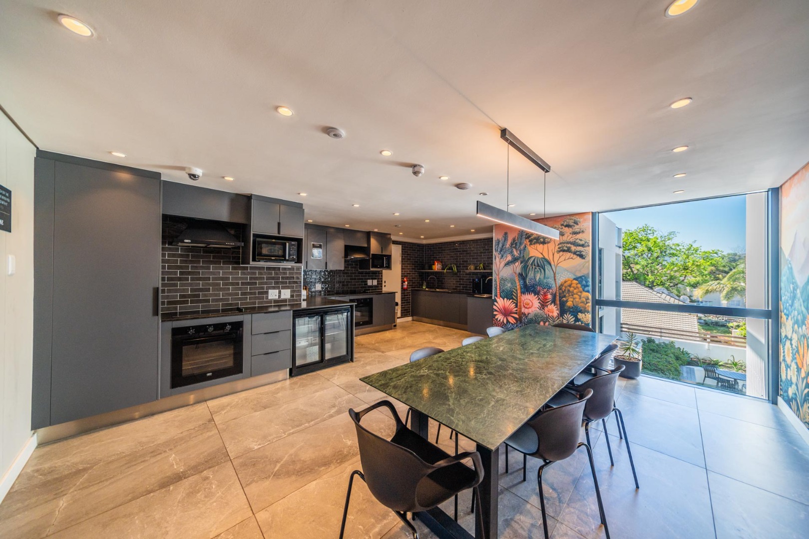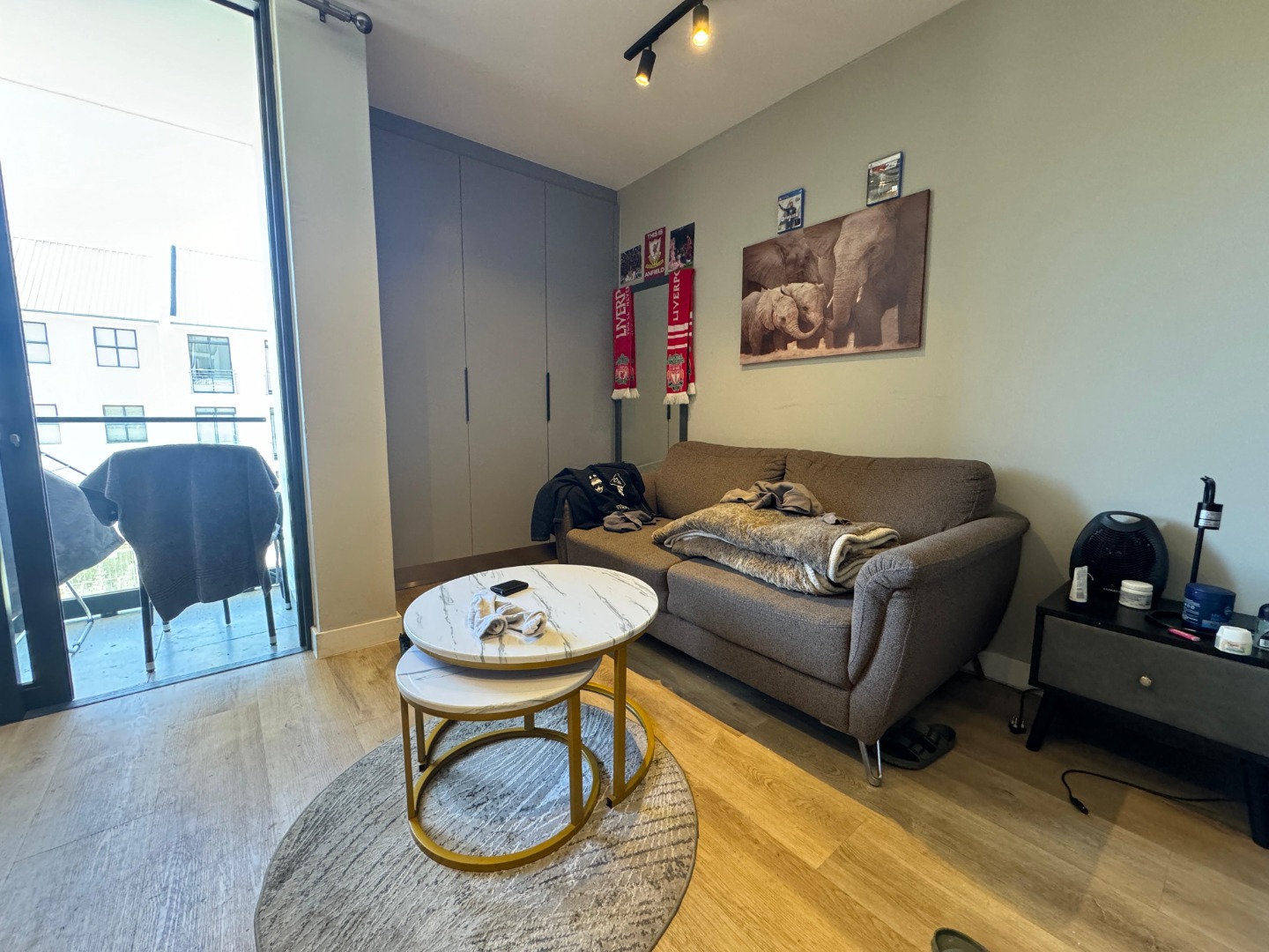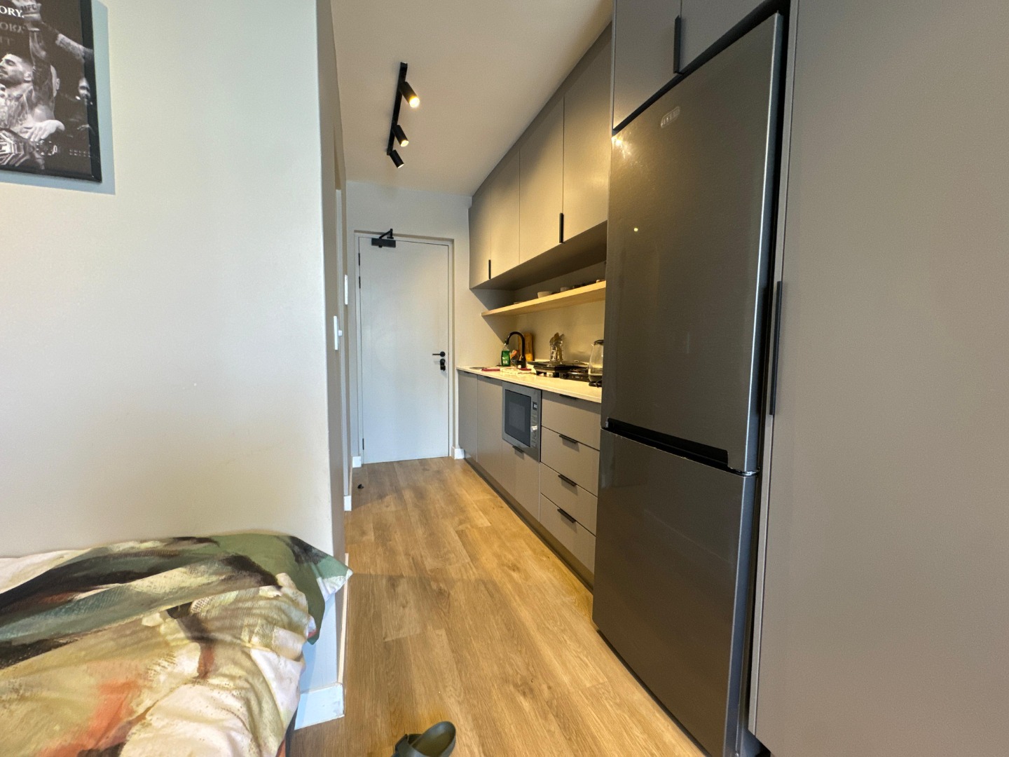 This modern, furnished studio apartment is situated within 'THE ONE' building in Dennesig, Stellenbosch. Designed for efficient living, the unit features a compact yet stylish kitchenette equipped with light grey cabinetry, white countertops, and integrated appliances including a microwave and refrigerator. The interior boasts contemporary wood-look laminate flooring and extensive built-in storage solutions, complemented by a dedicated desk area, ideal for students or professionals.