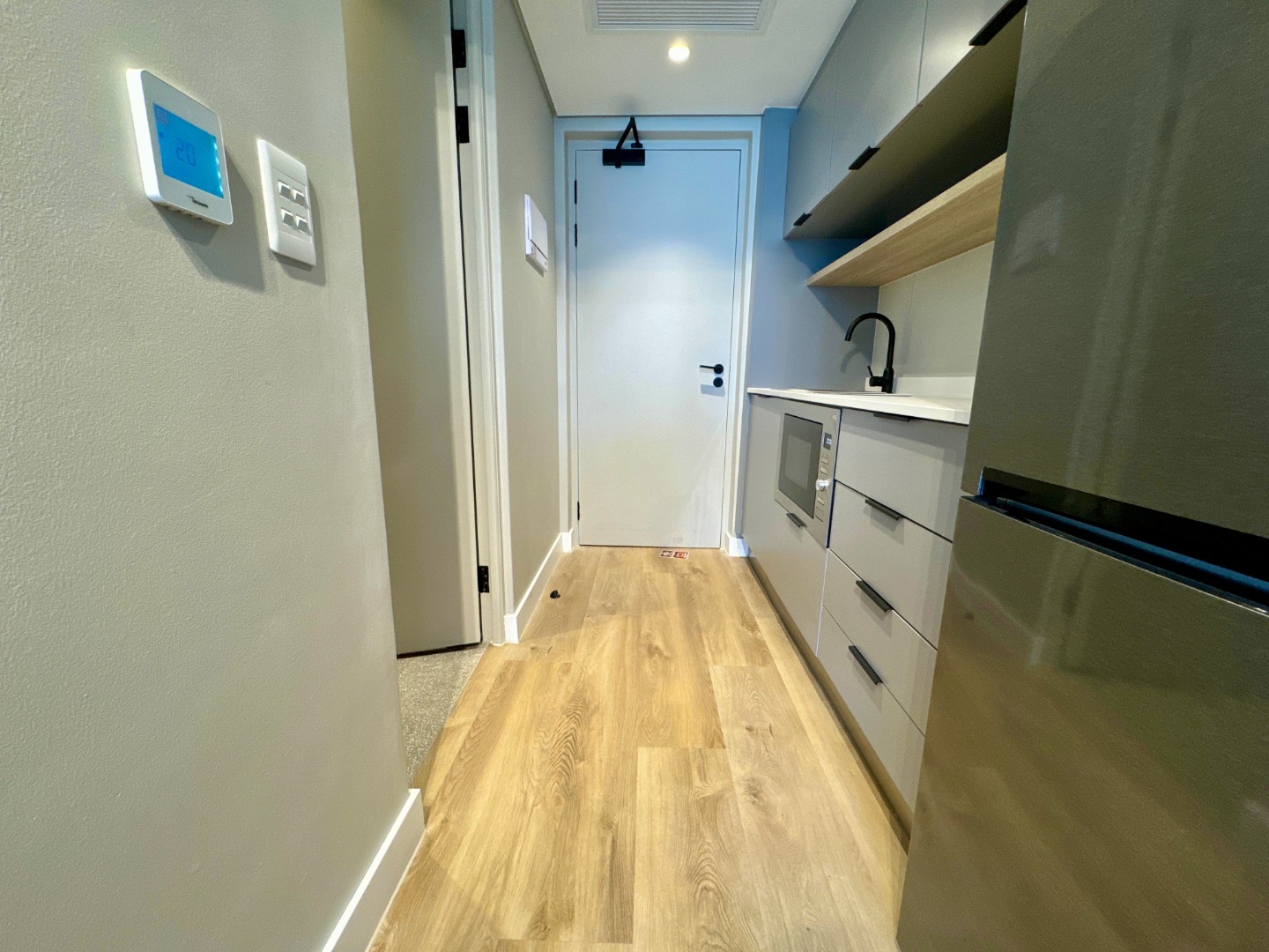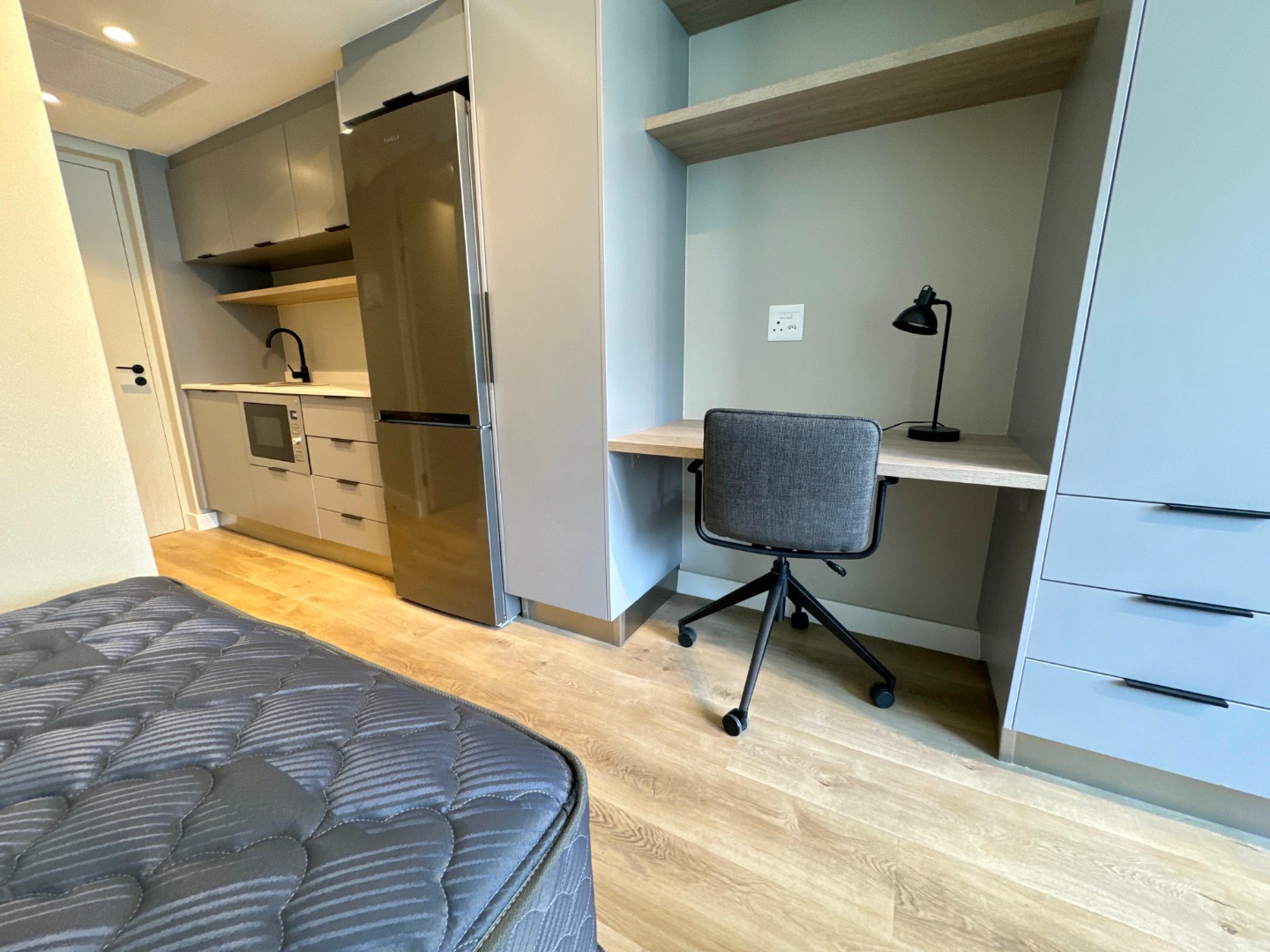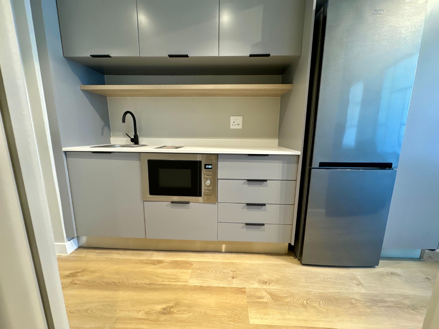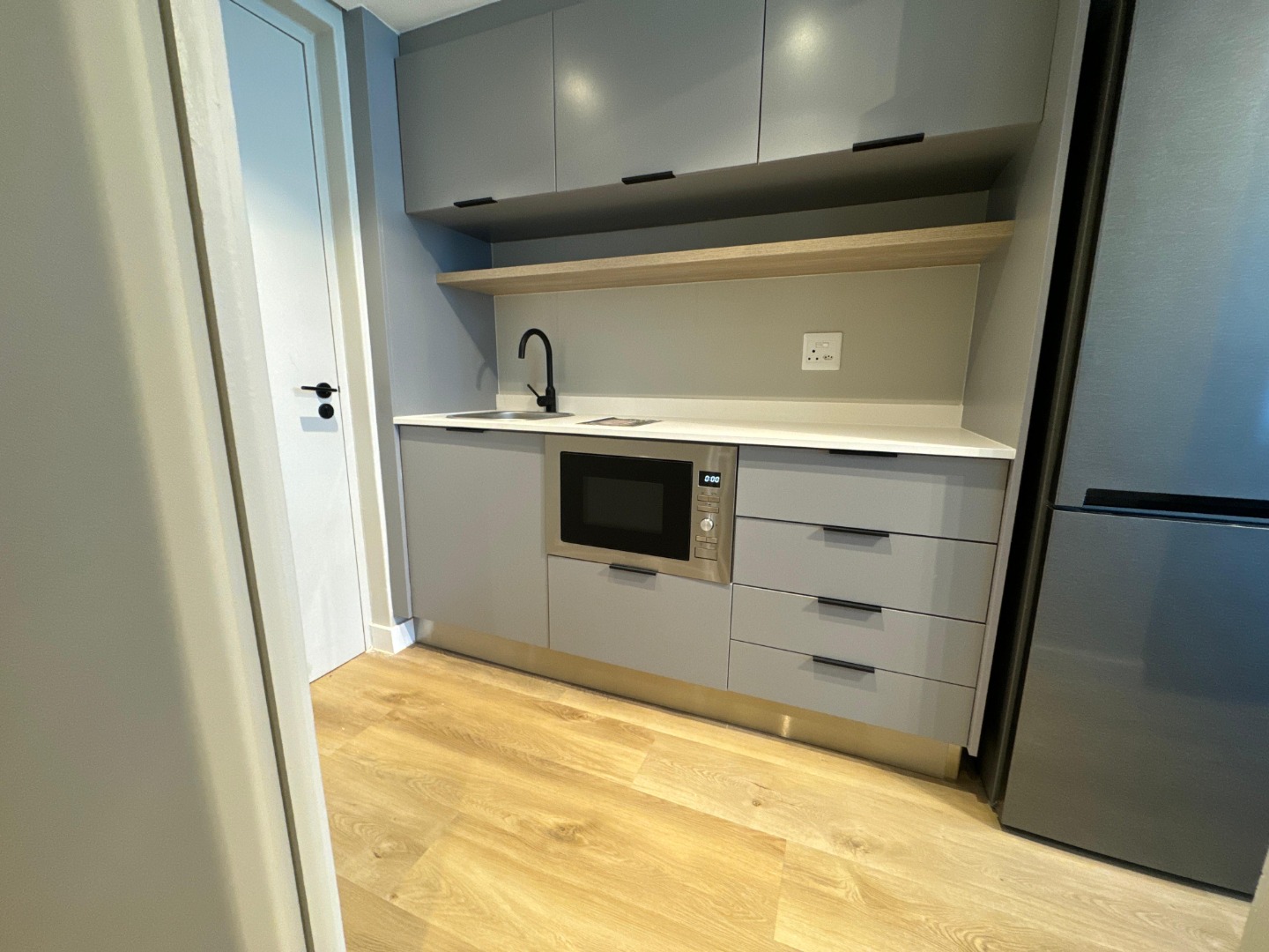 The well-appointed kitchenette is equipped with sleek grey