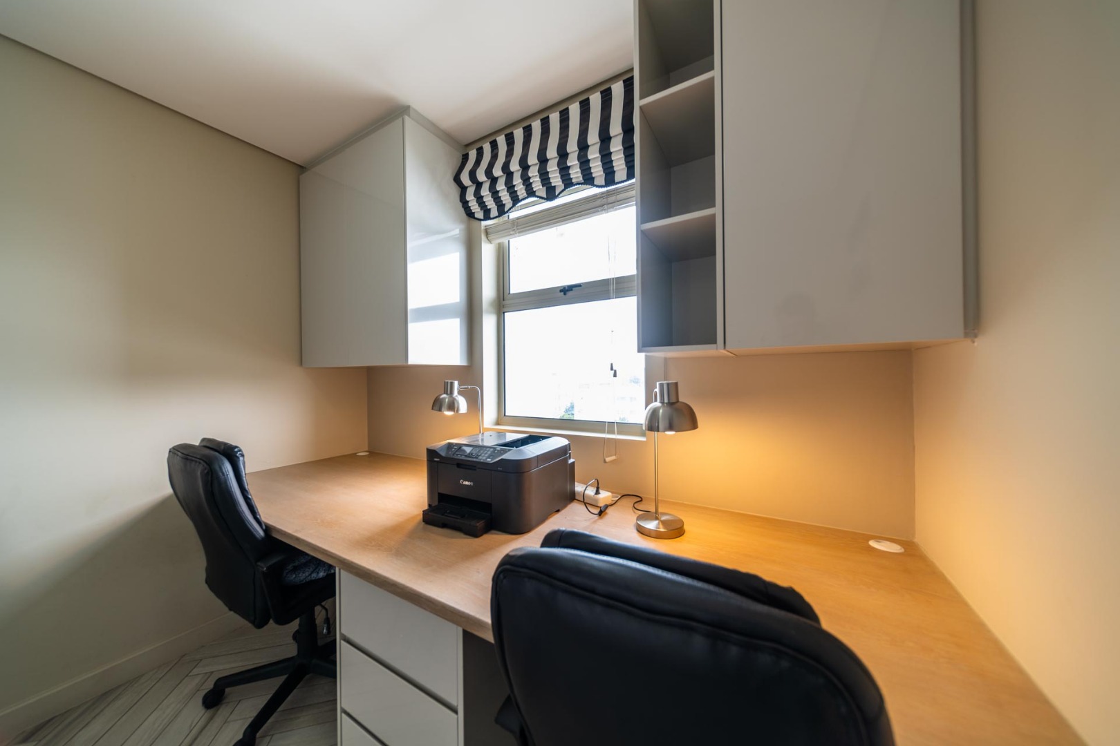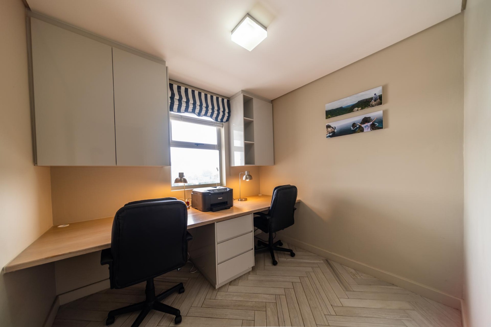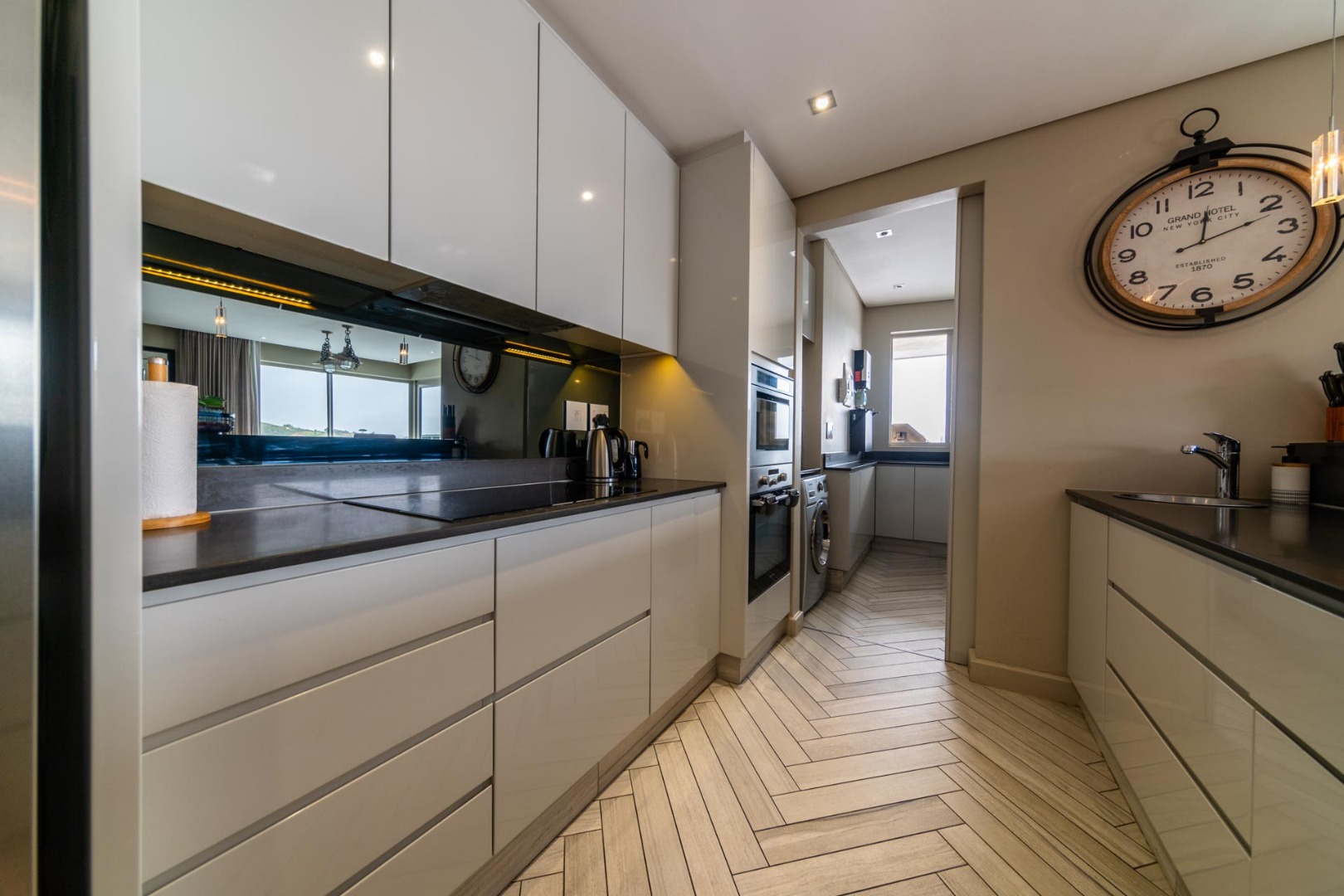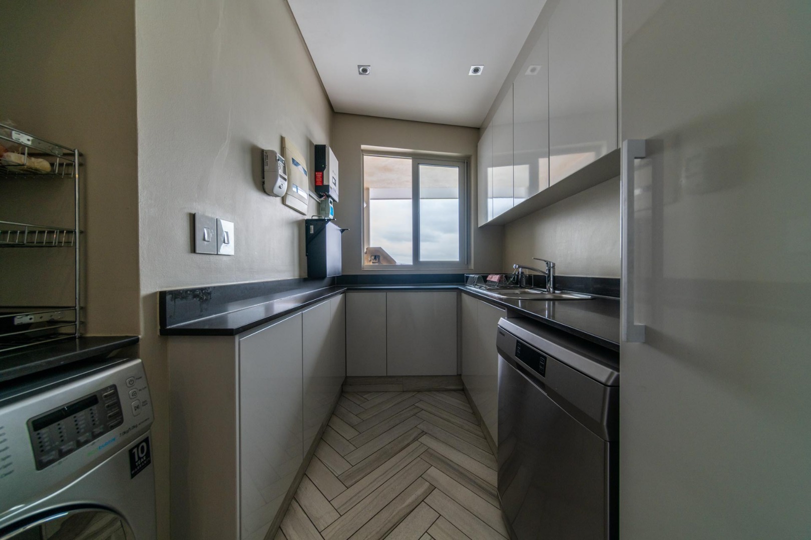 The beautifully furnished interior boasts a spacious 114 sqm living area, characterised by contemporary finishes and large windows that invite abundant natural light. The well-equipped kitchen includes a fridge-freezer, stove, oven, microwave, and a full complement of cutlery, crockery, and tea/coffee facilities. For added convenience, a washing machine and dishwasher are also included. The air-conditioned living area provides a lovely dining set, perfect for shared meals, alongside plush seating and a television. A dedicated study area offers a quiet space for work.