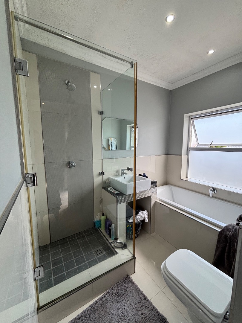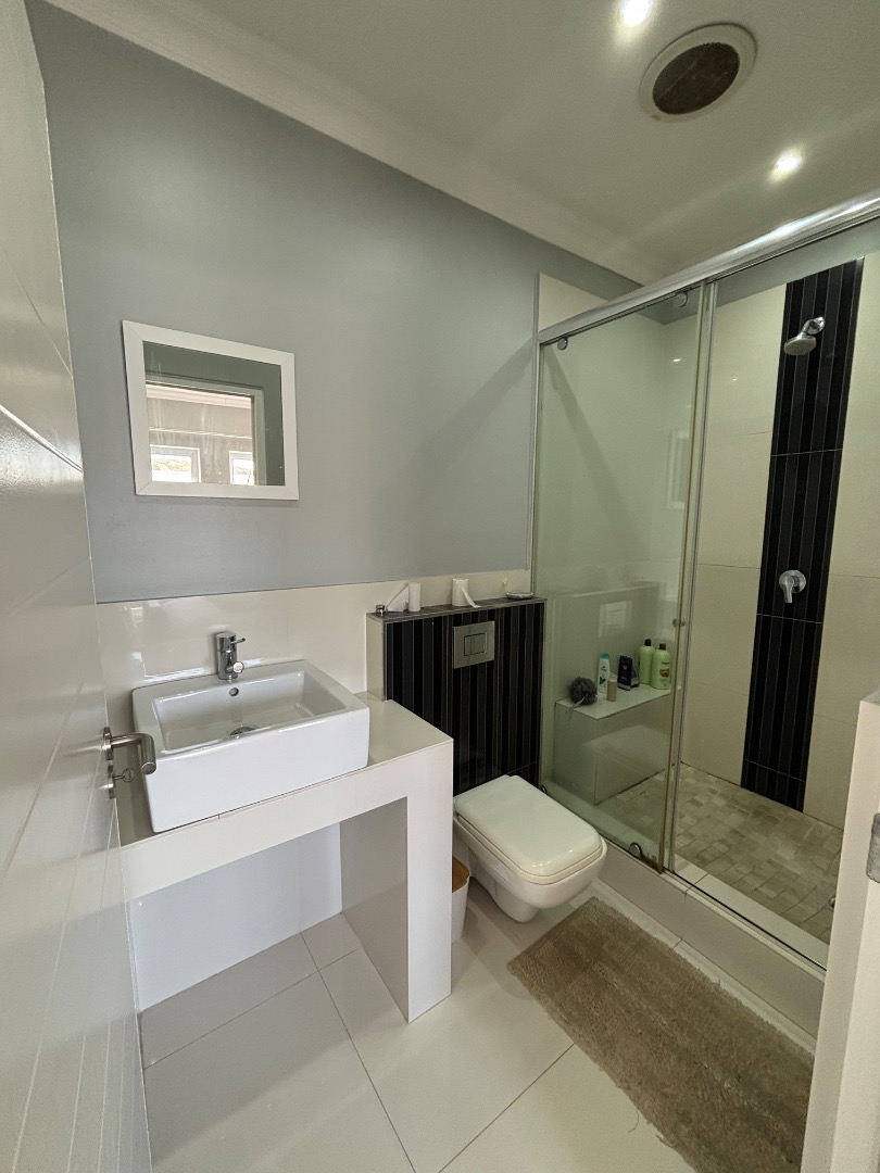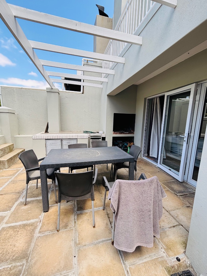 Each of the three bedrooms is complemented by its own en-suite bathroom, offering privacy and convenience. The property also benefits from a guest toilet, bringing the total to 3.5 bathrooms. Outside, a private paved patio area awaits, complete with a built-in braai and a white pergola, perfect for outdoor dining and entertaining. There is also a space with the potential for a small pool or water feature, as well as upper-level outdoor spaces that enhance the property's appeal. Parking is well catered for with a single garage and two additional parking bays.