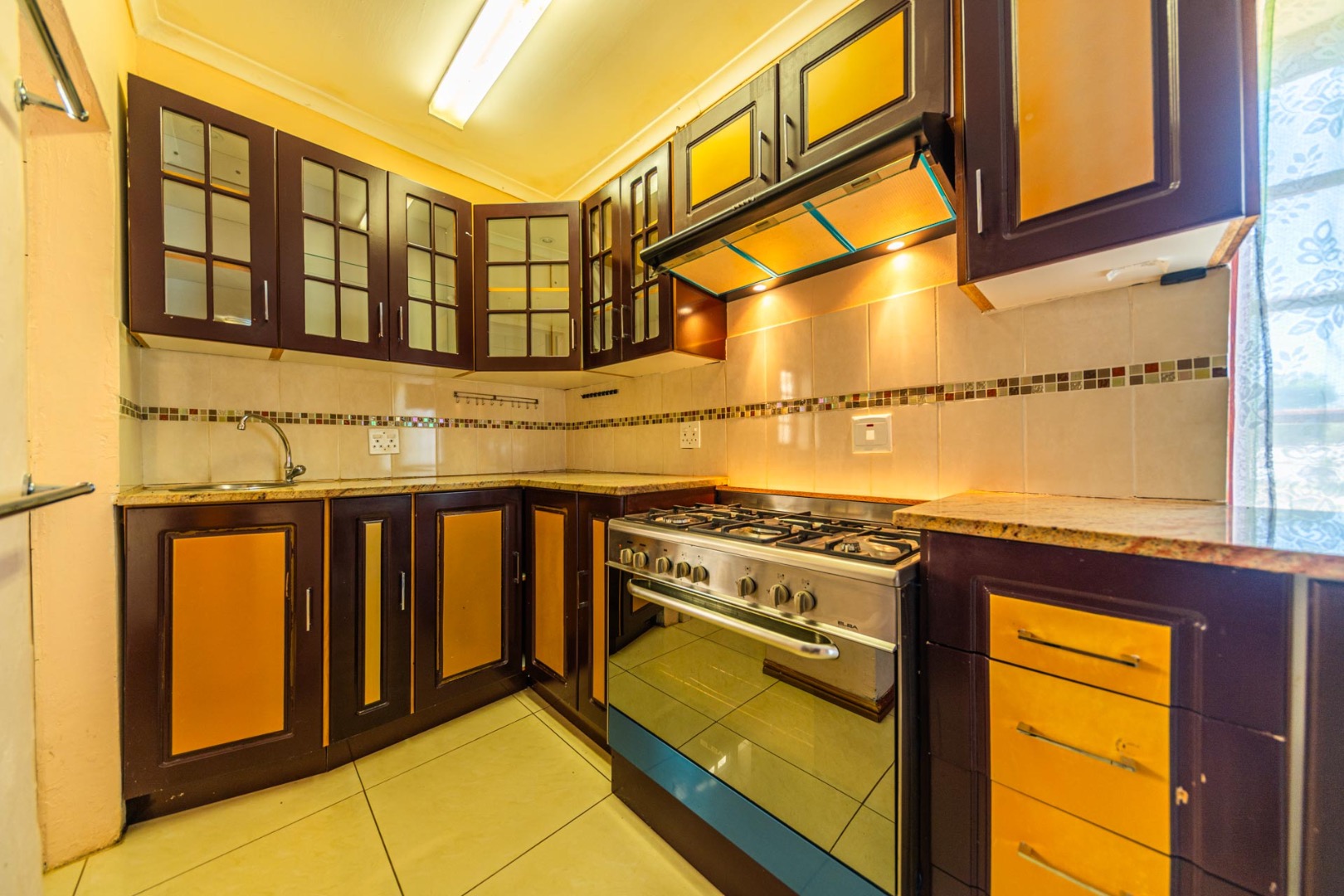 The well-appointed kitchen offers generous storage cabinetry, a built-in stove/oven, and a freestanding stainless steel gas range, catering to all culinary needs. The property boasts five comfortable bedrooms, including one with an en-suite bathroom, providing privacy and convenience. Tiled flooring extends across the primary living spaces and kitchen, while some rooms feature polished wooden floors, adding a touch of classic appeal.